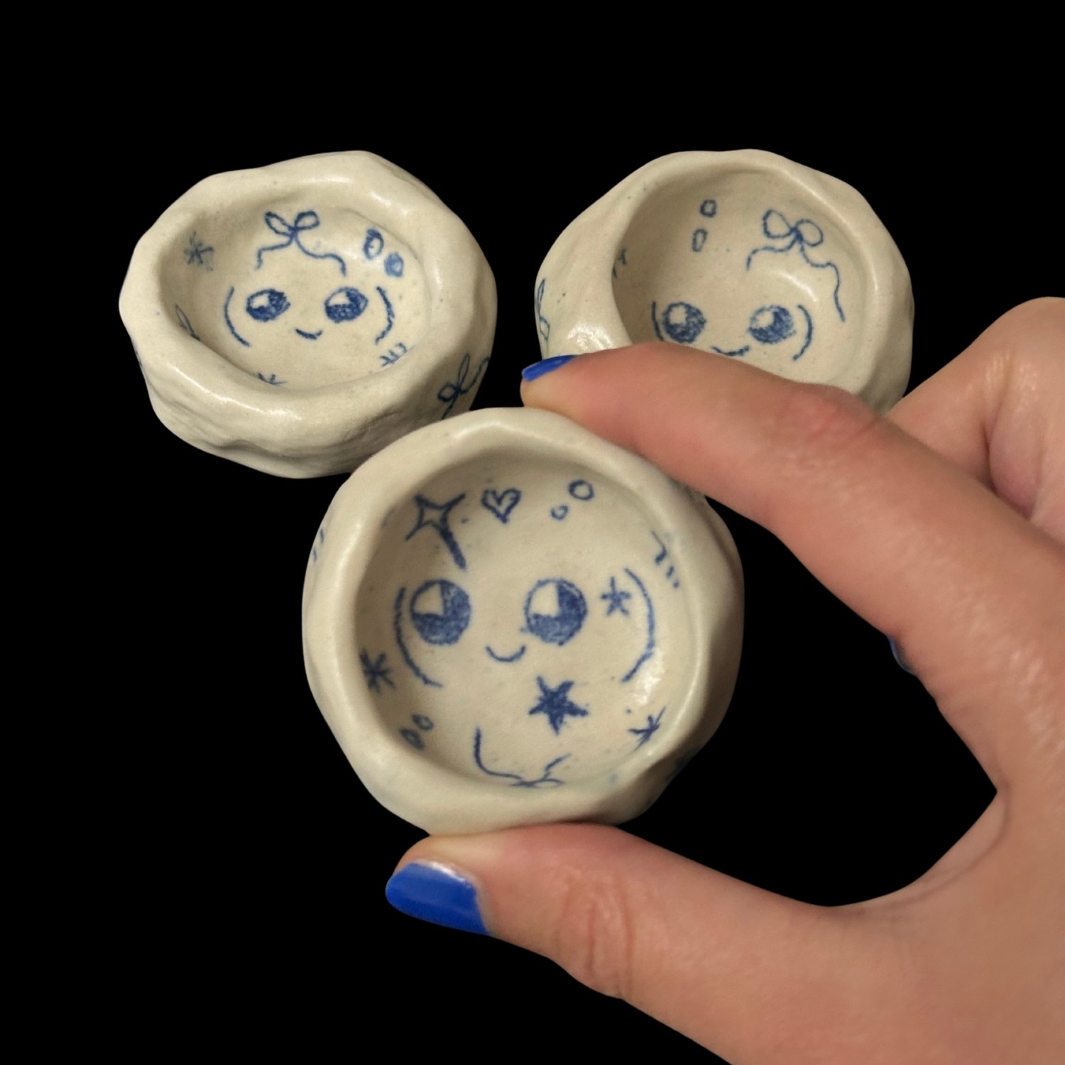 A mini hand built stoneware dish with hand drawn emoticons and decorative symbols.
